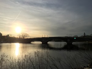 By mile 5 I was feeling really strong, and I kicked it up to a 7:20 pace–definitely bolstered after seeing J cheering like a maniac at the mile marker. The crowd had thinned out a bit and the wind had mercifully died down, so miles 5-9 felt pretty breezy at a 7:20 pace. Just as I was letting the glimmer of PR hope sneak into my mind, BAM! We hit the portion of the race along the water and the wind picked up like crazy–almost to this level, no joke. I threw my gloves back on, gritted my teeth (literally, the wind was blowing a bunch of sand and dirt into our eyes and mouths), and pushed my way through miles 10 and 11, hitting my slowest mile of the race (8:04). While the headwinds gusted for the remainder of the race, we turned off the water and they were a little bit less intense. I picked it back up and almost managed to negative split the last three miles, other than a little slowdown due to the sizable hill at mile 12 (YUP). I hit the last .1 at 5:50 pace and finished in 1:39:11, well below my goal of 1:40 and my second-fastest half to date! I finished feeling really strong–my legs actually had some juice left in them, but I was done having my breath knocked out of me by the wind. J and I grabbed some much-needed coffee and lunch at one of my old haunts–I used to work in the area and it was super fun to be back. Overall, this was a fun, competitive, and well-executed race. Highly recommend!