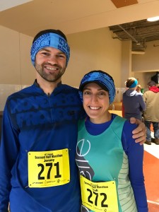 Saturday night I had a fair amount of trouble falling asleep, which is typical for me before races. Luckily I had gotten a great night of sleep on Friday night, so I knew I’d be fine for the race. Saturday morning we had breakfast and coffee in our hotel room before heading just a few miles down the road to Portsmouth High School, where the race starts. We easily parked right by the school and grabbed our race bibs and shirts fairly quickly. There wasn’t a secure bag check for this race, but we were able to leave our coats in the school’s cafeteria and just left our valuables in the car. It was chilly, with temps around 30 degrees at the start of the race, so I opted for tights, a warm base layer, gloves, and a buff. I probably slightly overdressed but I hate being cold at the beginning of races! I ended up taking off my gloves and buff by mile 3 😉