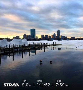 Saturday the weather was a little crazy–starting in the 60s and ending in the 30s during a 2 hour run! It was awesome to run with my pal Denise–she’s moving to Cali and I want to get in as many long runs as possible. Luckily she’ll be back for Boston–we ran Sugarloaf together and she’s the best marathon buddy. This morning I was moving slow after we went out to a fun concert, but J and I got out for some chilly but nice recovery miles together.