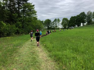 In the morning, we drove the hour or so to the race start in New Gloucester. We parked, grabbed our bibs (which were marked with white tape to indicate we were swapping from the 50k to the 25k–shame!), and met up with our friend Danielle and her friend Rachel for the start. Everything was smooth and easy, and the whole start/finish area felt like a big party. Right on time, we took off across the start line together. My plan was to run the flats and downs and hike the uphills, but the first few miles felt pretty breezy as we chatted and ran. Turns out those first few miles were mostly downhill, so that makes sense 🙂