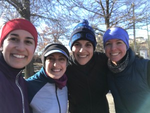 Wednesday I treated myself to a rest day and did a bunch of foam rolling along with my core and mini-band work. Thursday dawned super icy so I hit the treadmill for my tempo run. I had some technical issues with the interface on the mill at the gym, and as usual, it went by slowly, but I got it done. Friday was a super easy recovery run before a huge day of running fun on Saturday! I met up with some of the Oiselle gals for an 18 miler. It got up to 50 degrees and I felt pretty good the whole time! We ran on the Boston course and ended up with 852 feet of elevation gain. My fueling was on point and we even finished with a couple of strong fast miles at the end. As always, happy to have great company 🙂